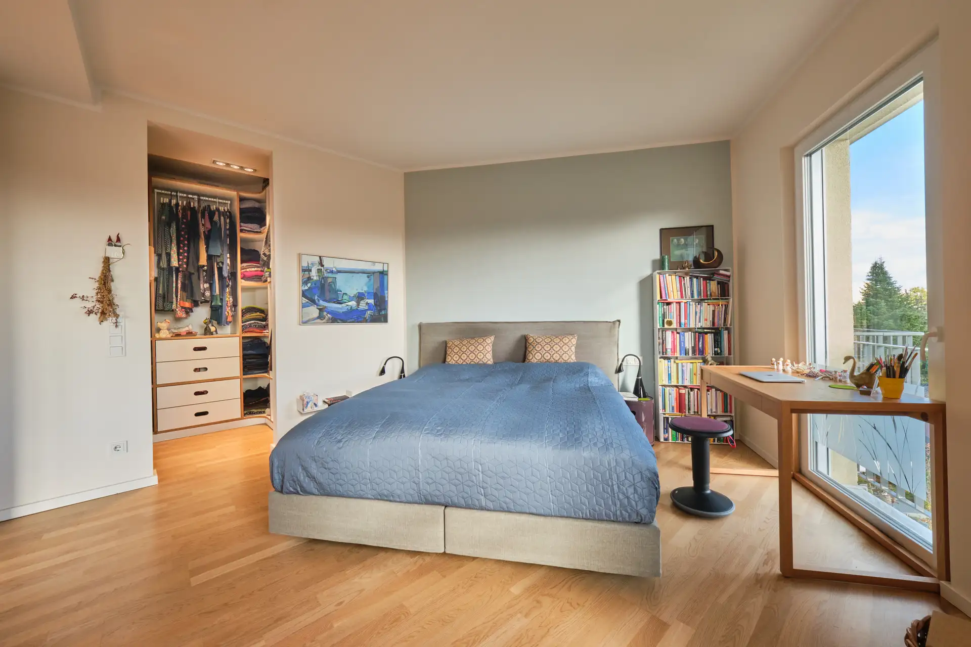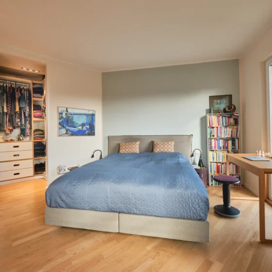Vom offenen Wohn-/Essbereich betreten Sie über eine maßgefertigte Schiebetüranlage von der Möbelmanufaktur Rüdnitz den Schlafbereich, der mit guten 15 m² eine Vorzeigegrösse hat und Ihnen den Vorteil eines wiederum mit handgefertigten Möbeln ausgestatteten, begehbaren Kleiderschrankes mitliefert. Durch 2 bodentiefe Fenster strömt südseitig warmes Licht in ihren Schlafbereich.