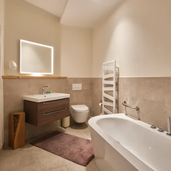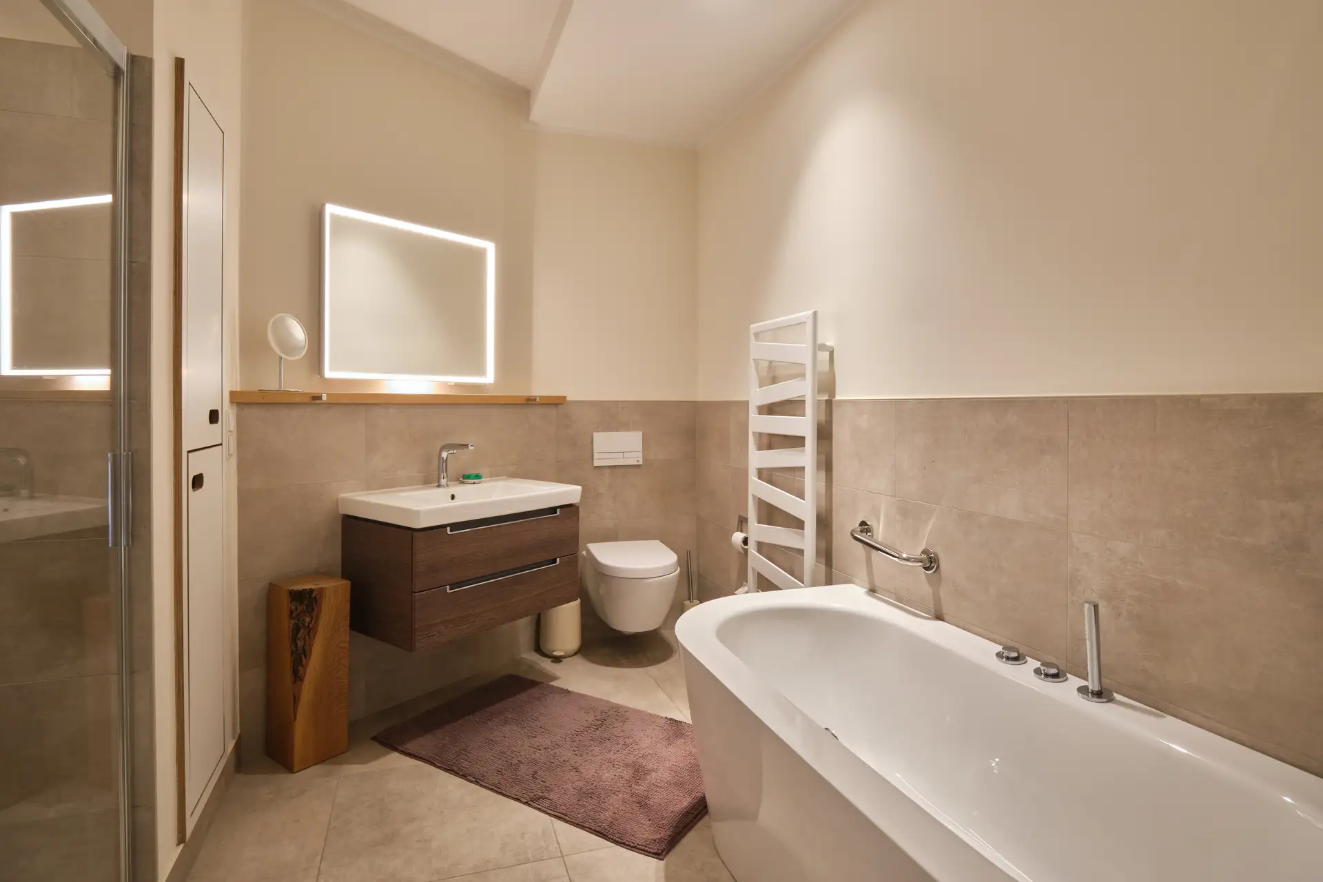 Die Wohnung erreichen Sie über den modernen Fahrstuhl eines 3-stöckigen Wohnensembles, ruhig gelegen, infrastrukturell sehr gut angebunden und mit Sichtachsen, die Sie ins Schwärmen geraten lassen. Die Wohnung – um es vorweg zu nehmen – besticht zudem durch die Handschrift eines Berliner Innenarchitekten, der mit Präzision und Liebe zum Detail neben der Funktionalität hohen Wert auf sämtliche Materialien gelegt hat. Sie betreten den offenen Flur und ihr Blick streift durch die großen Fensterfronten die Silhouette der Blütenstadt Werder an der Havel. Interessant. Direkt vor ihren Augen sehen Sie das erste eingepasste Einbaumöbel der Möbelmanufaktur Rüdnitz, bekannt für handgefertigte, maßgeschneiderte und langlebige Echtholzmöbeleinbauten. Hiervon finden Sie neben der eben angesprochenen Garderobe auch eine Schiebetüranlage zum Schlafbereich, die dortige Ankleide (begehbarer Schrank), Ergänzungen in der Küchenzeile und nicht zuletzt im Bad, hier den Wandschrank. Apropos Bad. Dieses begehen Sie vom Flur zur linken Seite. Die Ausstattung ist exklusiv. Die Badewanne BetteStarlet ist mit einer 3-Loch Wannenarmatur von Keuco ausgestattet. Das Wand-WC, als auch der keramische Waschtisch sind von Duravit, die Waschtischarmatur ebenfalls von Keuco. Die geräumige Echtglasdusche ist begehbar und hier wird Ihnen ein Duschsystem mit „rainshower“ der Marke Vigour angeboten. Ergänzend ist zu erwähnen, das ein beheizbarer Bad-Heizkörper (elektrisch) und ein Designer-Leuchtspiegel das Ambiente des niveauvollen Masterbades abrunden.