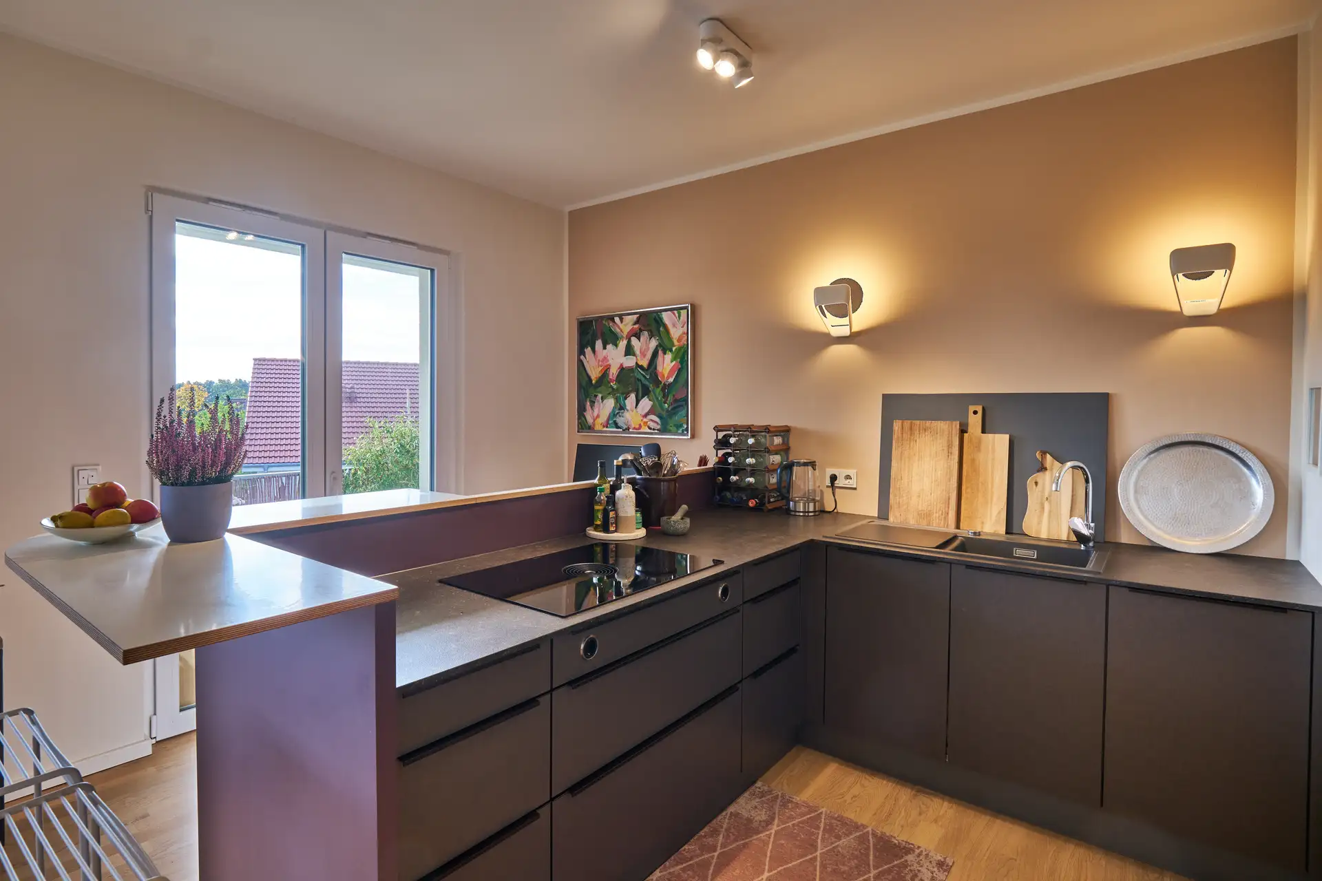 Die Einbauküche hat alle denkbaren Annehmlichkeiten, die das Kochen zur Lust werden lassen. Das große Induktionskochfeld mit integrierter Lüftung ist von Bora, für das Kühlen ihres Riesling ist der Kühlschrank von Zanker verantwortlich. Alles andere, übernimmt die Firma Bosch. Aus ihrer Feder kommt sowohl der Gefrierschrank, der Backofen und der Geschirrspüler. Das verbaute Spülbecken kommt aus der Serie Zenar 55 von Blanco. Es ist – wie Sie es vermutet haben – an alles gedacht, inklusive kurzer Wege zum sonnenverwöhnten Esstisch für Sie, bzw. die gesamte Familie. Es gibt wenige Türen, diese aber haben ein Sondermaß, eine Höhe von 2,25 m, so daß auch sehr grosse Menschen diesen Komfort schätzen werden. Die Badtür überzeugt zudem mit einem imposanten Accessoire, einem aus der Seefahrt bekannten Bullauge.
